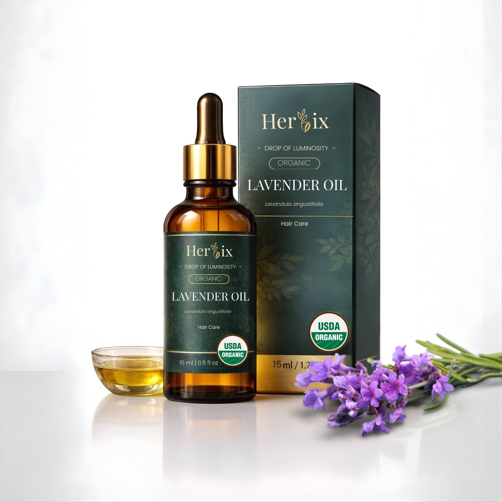 Herbix Organic Lavender Oil for hair care with calming Lavandula angustifolia. USDA Organic certified. 15ml dropper bottle for easy use.