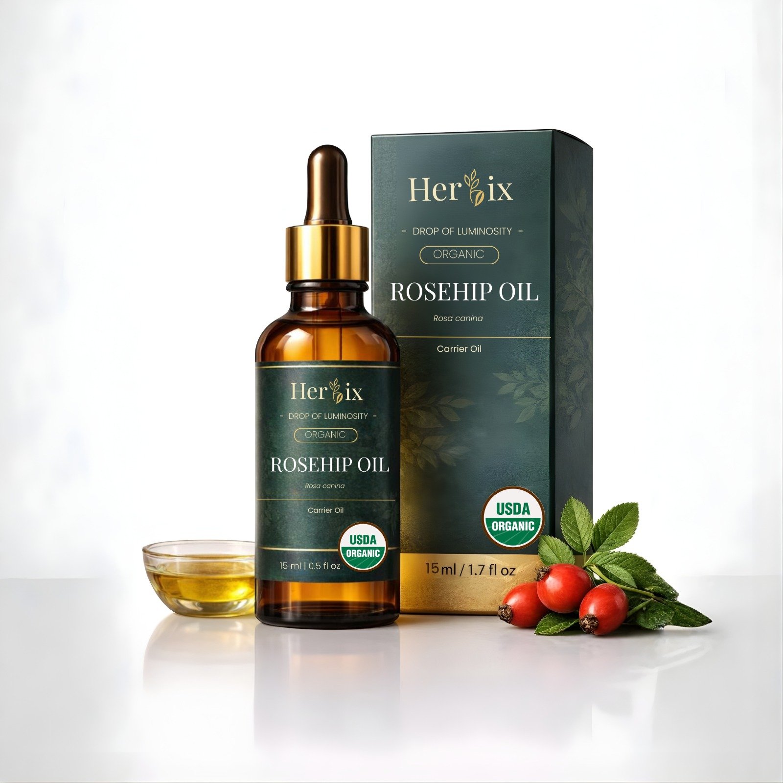 Herbix Organic Rosehip Oil (Rosa canina) is a nourishing carrier oil for skin and hair. USDA Organic certified. 15ml dropper bottle.